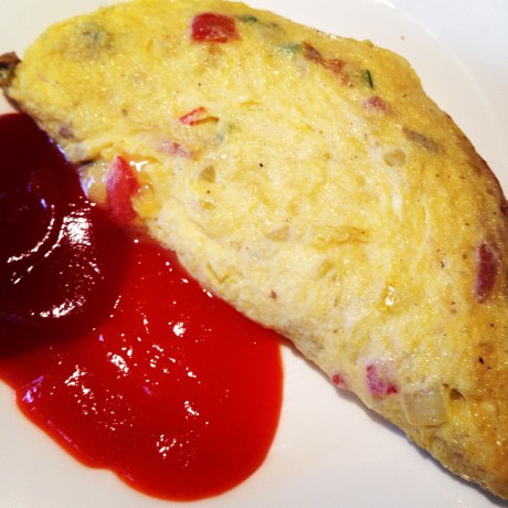 The sweet and chili sauce is a perfect condiment for the omelet.