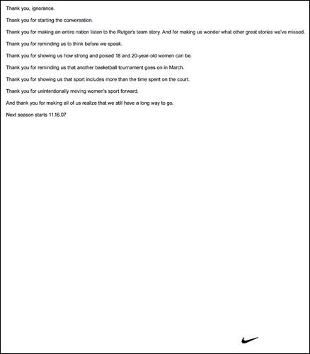 I saw this Nike ad today and think it is a good example of situational advertising / advertising in context. Nike hopes that this ad will stir conversation about racism in America. It took out a full page ad in New York Times on 15 April 2007 and followed it up with banner ads in websites such as Flip.com, ESPN.com, FoxSports.com and NikeWomen.com. The creative execution by Wieden & Kennedy, Portland indirectly thanks Don Imus for bringing the issues of race relations and sexism to the forefront. The copy on the print ad reads:
