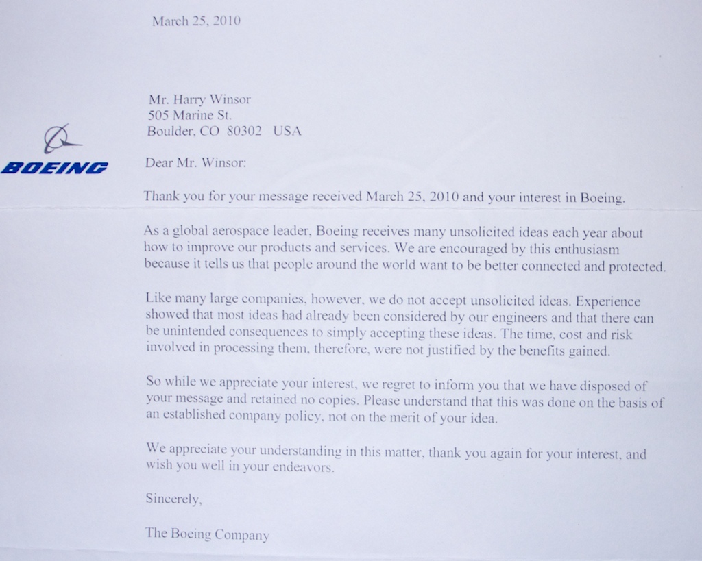 I’m a Boeing communications director. I think I can address your comments. As you state, we have to respond to the thousands of unsolicited ideas we receive in a way that protects us against possible infringement claims. Having said that, we can do better when the idea clearly comes from a child as enthusiastic as your son. We will work on this. I hope Harry remains fascinated by airplanes and grows up to be an airplane designer. To help him and others like him we maintain the following website. http://www.boeing.com/companyoffices/aboutus/wond…I hope he enjoys it.